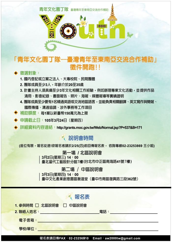 文化部辦理「青年文化園丁隊--臺灣青年至東南亞交流合作補助」自即日起受理申請