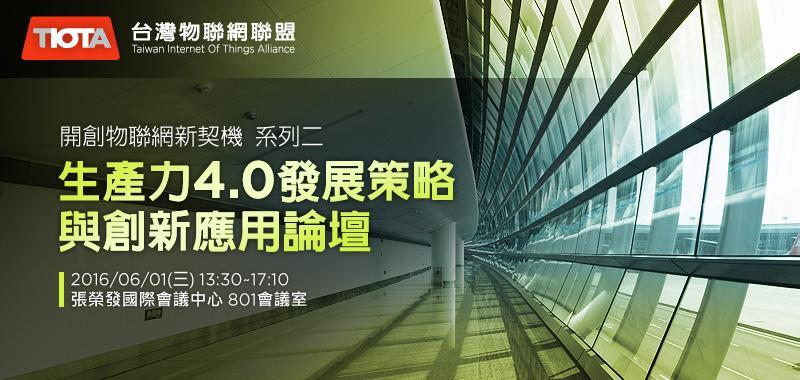 台灣物聯網聯盟將於2016年6月1日(三) 舉辦「生產力4.0 發展策略與創新應用論壇」,邀請物聯網專家企業們進行專題演講及綜合座談,希冀再次建立產官面對面的機會,延續這股產業轉型的氣勢。