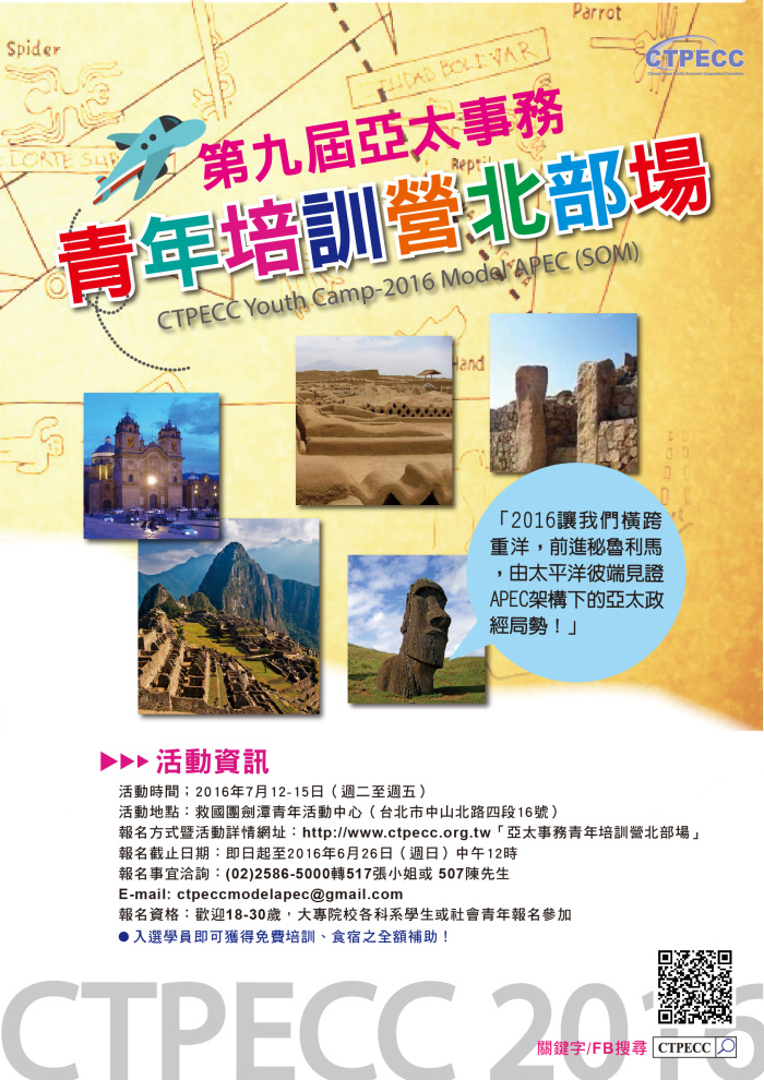 一、太平洋經濟合作理事會中華民國委員會(CTPECC)訂於本(105)年7月12至15日假救國團劍潭青年活動中心(台北市中山北路四段16號)舉行「2016亞太事務青年培訓營-Model APEC (SOM)北部場」。