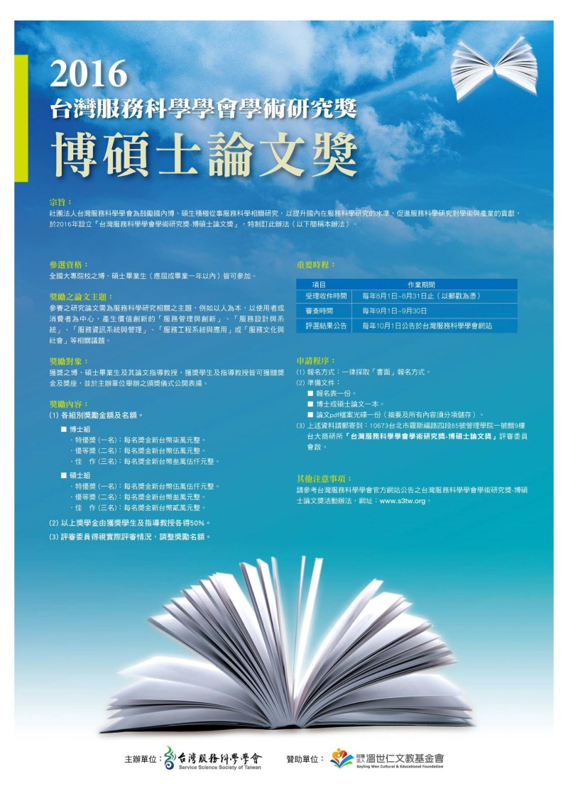 社團法人台灣服務科學學會為鼓勵國內博、碩生積極從事服務科學相關研究,以提升國內在服務科學研究的水準,促進服務科學研究對學術與產業的貢獻,於2016年設立『台灣服務科學學會學術研究獎-博碩士論文獎』