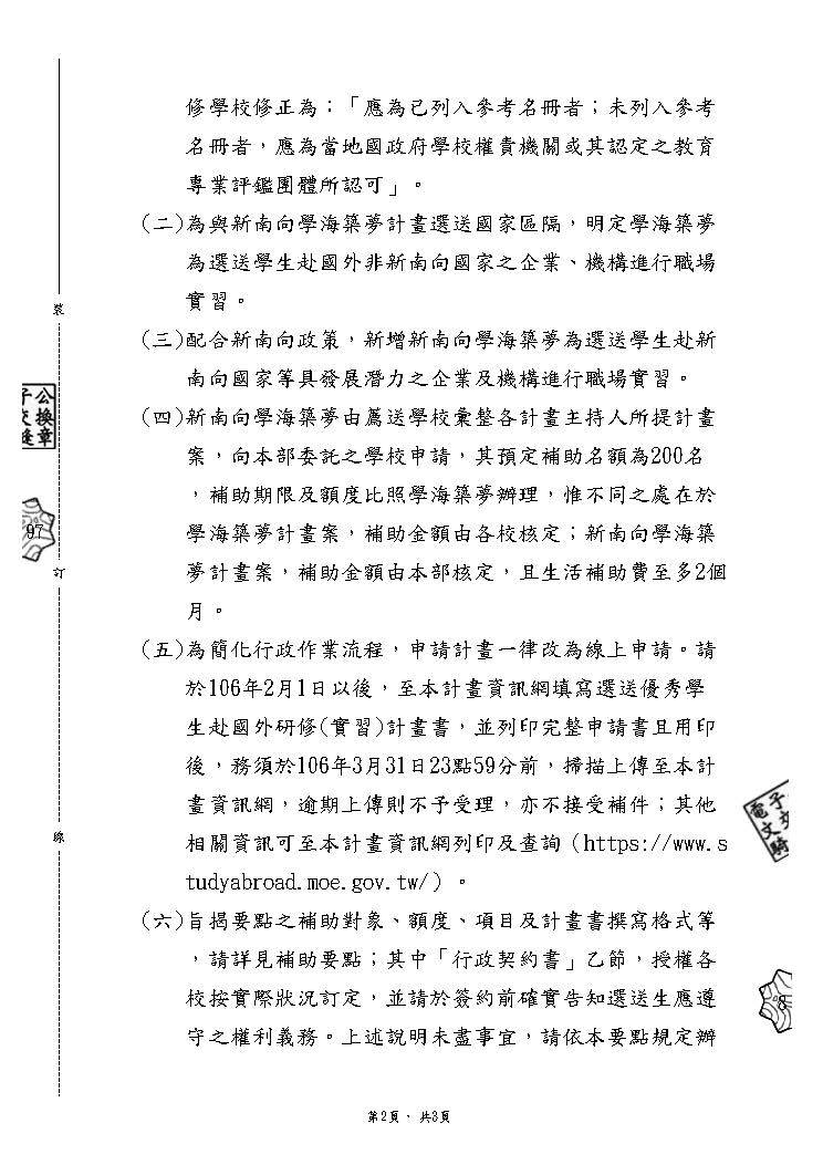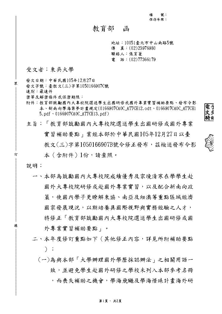 「教育部鼓勵國內大專校院選送學生出國研修或國外專業實習補助要點」業經本部於中華民國105年12月27日以臺教文(三)字第1050166907B號令修正發布