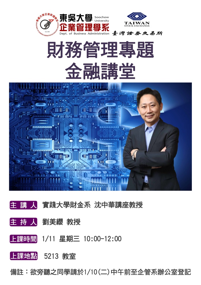 【演講】金融講堂1/11(三)邀請實踐大學財金系沈中華講座教授至本系專題演講