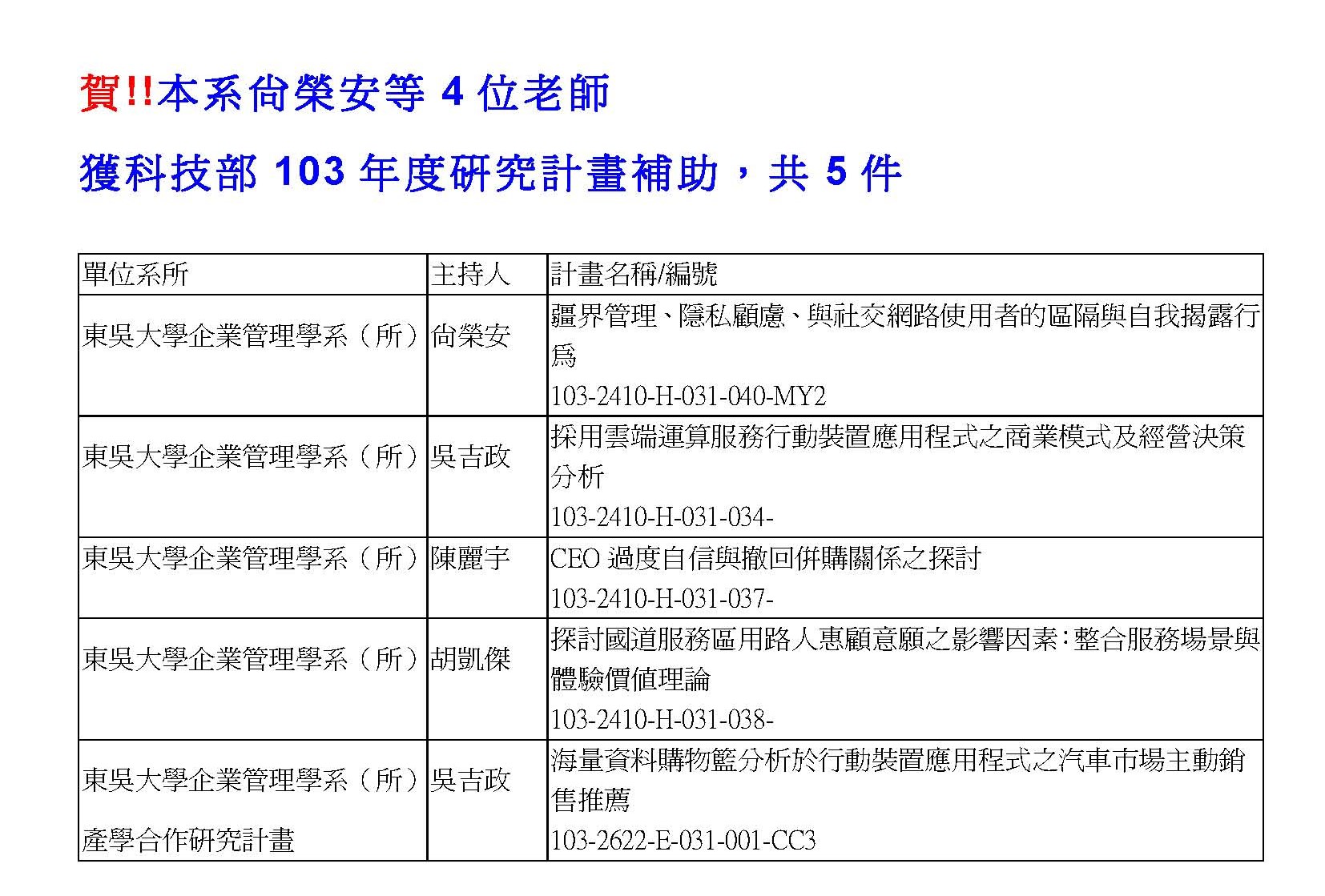 本系尚榮安等4位老師 獲科技部103年度研究計畫補助,共5件